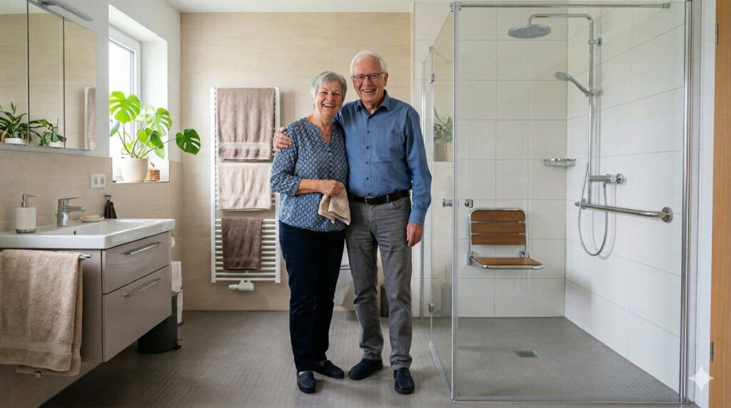 Glückliches Ehepaar im altersgerechten Badezimmer (erstellt mit KI) – ©Altersgerecht Modernisieren